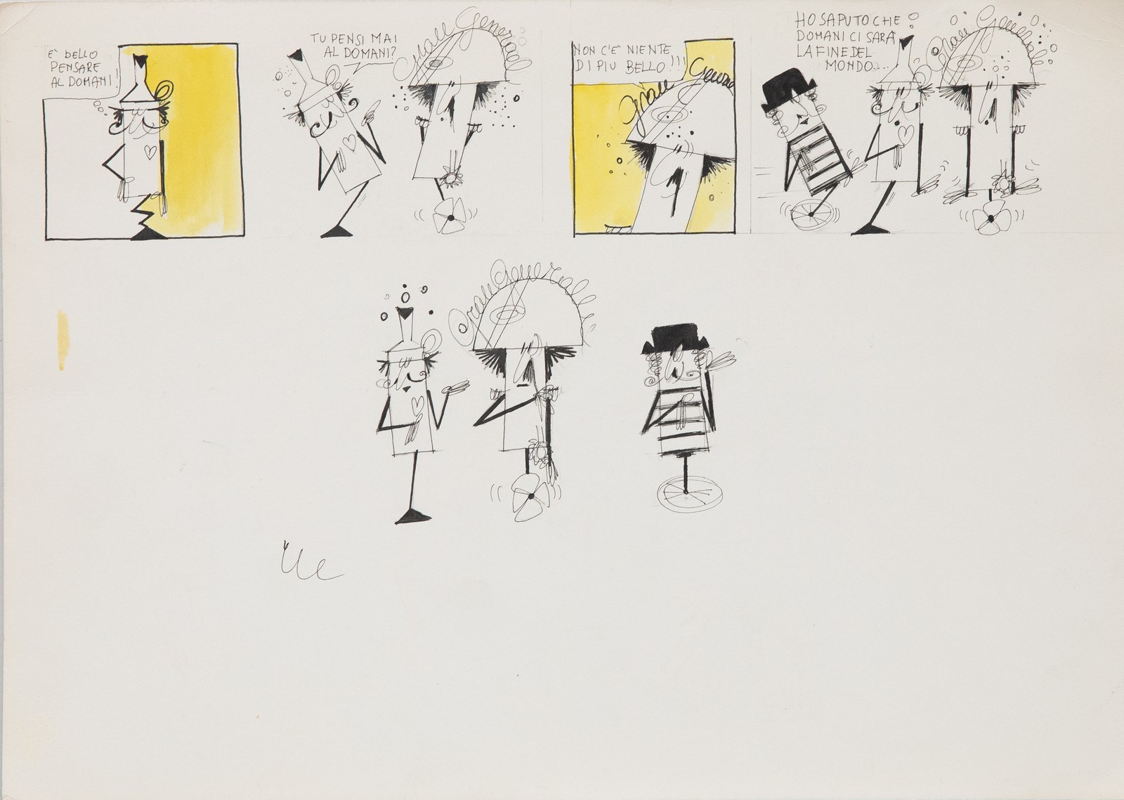 LODOLO FILM Dalla serie sketches dei Posteros. Tecnica mista su cartoncino. Cm 35,00 x 25,00. Il lotto proviene dagli archivi dei collaboratori della Lodolo Film, storica società di spot pubblicitari e di animazione italiana nata verso le fine degli anni 50. I Posteros, personaggi di fantasia, primitivi del futuro, nascono dalla collaborazione di Pino Pascali con la Lodolo film nel1958, un anno prima del suo diploma all’Accademia di Belle Arti di Roma; sodalizio che durò sino al 1967. Sandro Lodolo, titolare della casa di produzione pubblicitaria, e Pino Pascali, nel ruolo di creativo, realizzarono innumerevoli spot e cartoons pubblicitari. Gli Intermezzi che videro proprio i Posteros come protagonisti furono eseguiti , sia in bianco e nero che a colori, nel 1962 e nel 1968, anno della morte di Pascali, quando vennero ripresi da Lodolo come studio per i personaggi di un nuovo contenitore pubblicitario del secondo programma della Rai.