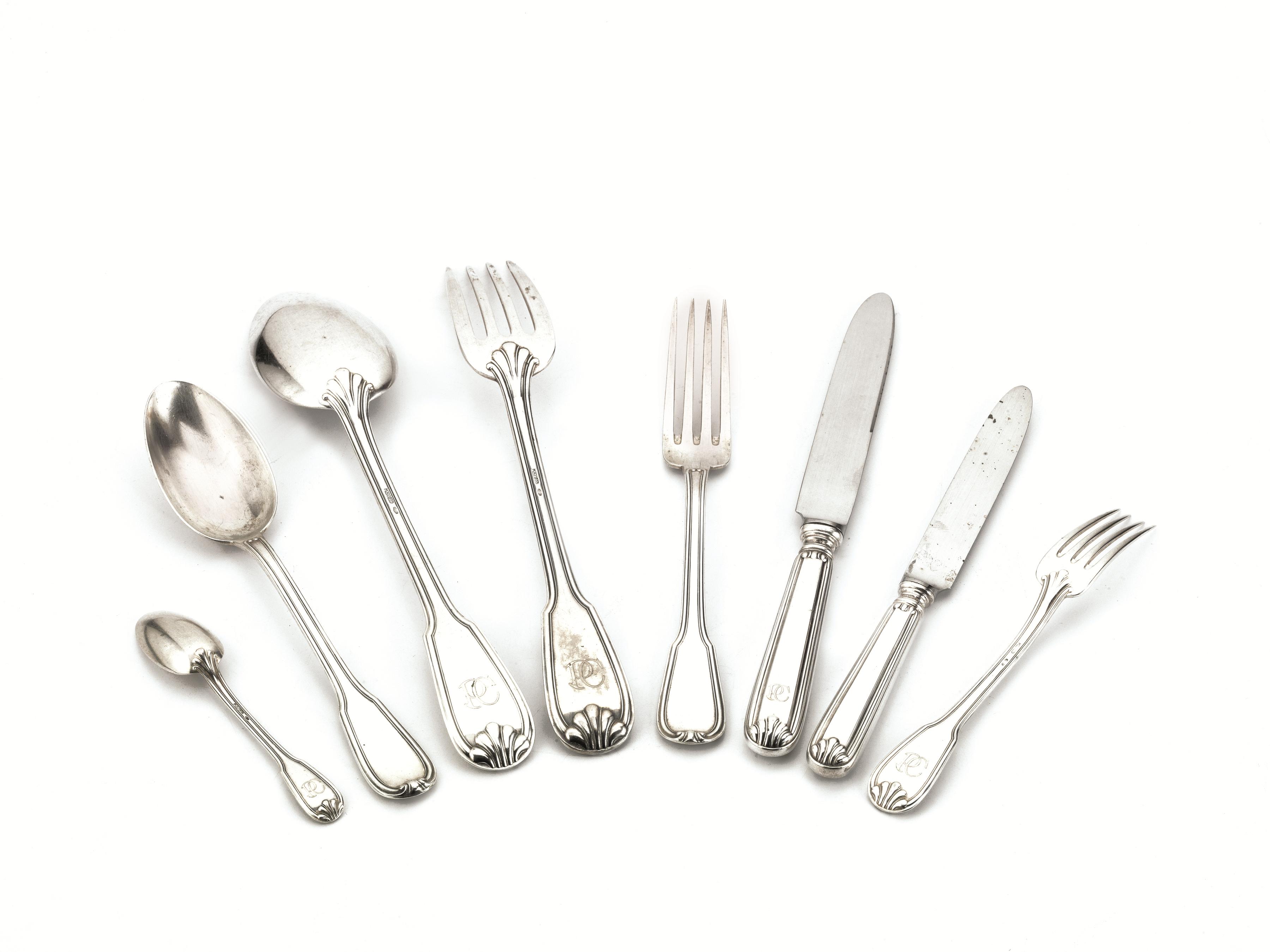 Servito di posate, sec. XX, in argento, manici incisi con monogramma PC e terminanti a volute composto di centotredici pezzi, peso netto g 4.750; peso comprese le posate con parti metalliche g 7.000 (113)