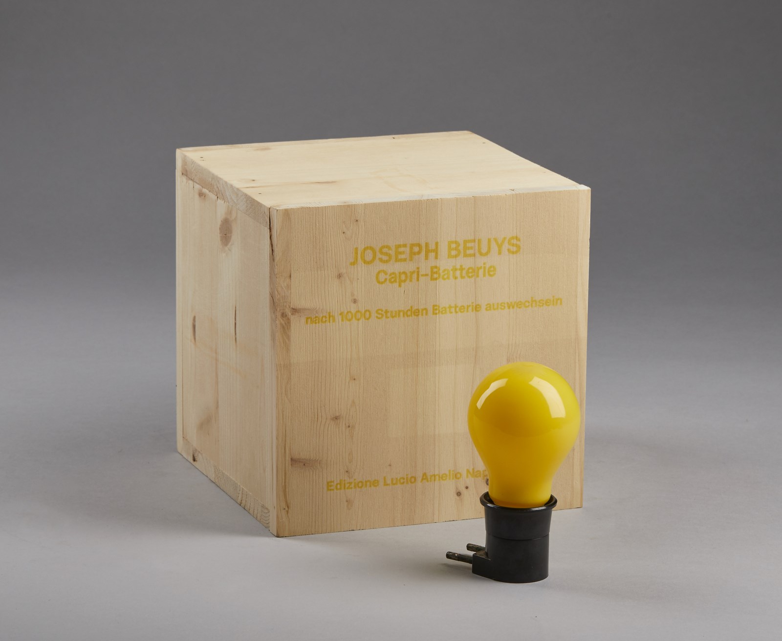 BEUYS JOSEPH (1921 - 1986) Capri-Batterie. . 1985. Multiplo. Cm 6,60 x 11,70 x 5,80. Multiplo composto da lampadina (Mazda) con timbro a inchiostro del produttore e presa di corrente. Edizione totale: 200 esemplari + 50 a.p. Edizione Lucio Amelio, Napoli. Esposizioni: Joseph Beuys Multiplar och Grafik Galleri Fahl, Stoccolma, 1988 (un altro esemplare); Joseph Beuys A11 Artforum, Monaco, 1990 (ill. p. 224 un altro esemplare); Sei Stanze per Beuys a Venezia Fondazione Bevilacqua La Masa, Venezia, 2000 (ill. p. 143 un altro esemplare); Nature/Artifice: Contemporary Works from the Collection Rhode Island School of Design Museum, Providence, 2010 (un altro esemplare). Pubblicazioni:Joseph Beuys, Antwerp, Galerie Ronny van de Velde & Co. (ed.), 1988 (un altro esemplare); J. Schnellmann,Joseph Beuys Die Multiples Munich, 1992, p. 499 n. 546 (un altro esemplare); Joseph Beuys Parigi, Centre Pompidou, 1994, p. 21 (un altro esemplare); Joseph Beuys, New York, Hirschl & Adler Modern (ed.), 1988, p.107 n. 71 ill. Confezione originale presente. Lievi difetti.