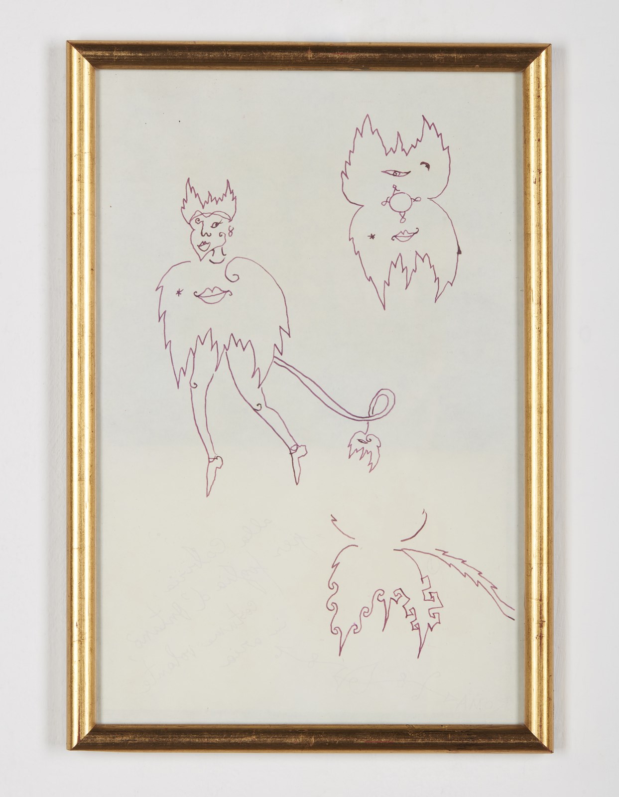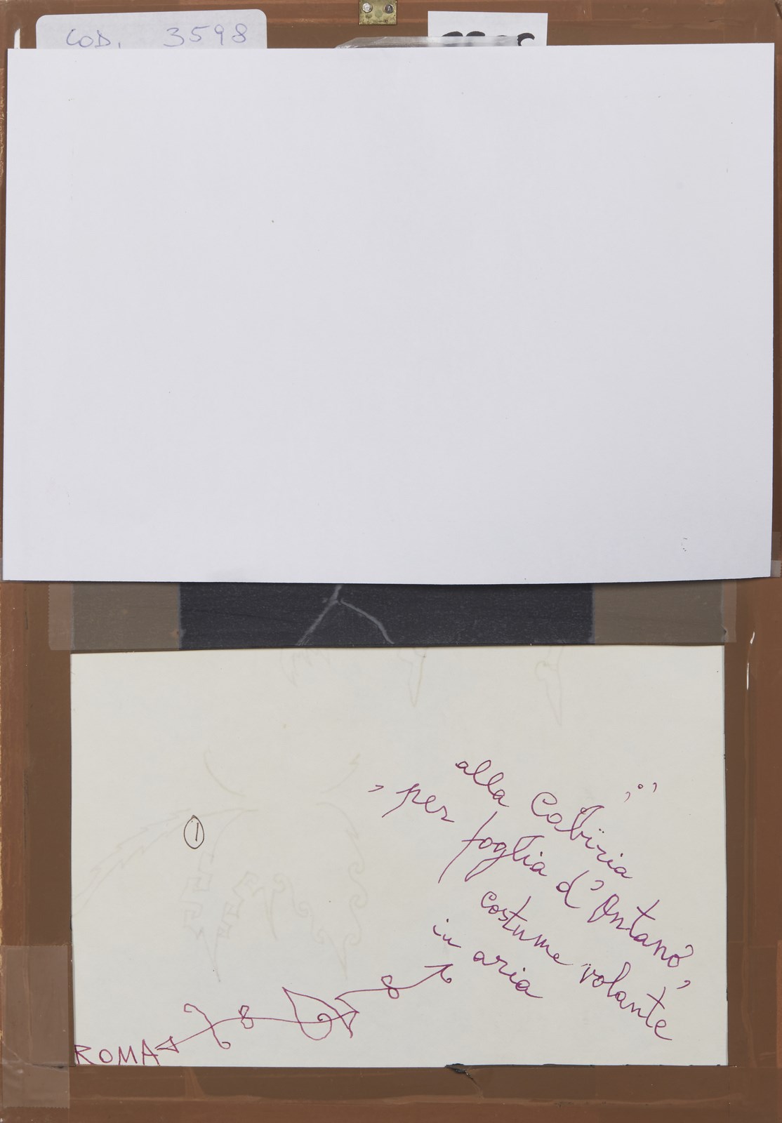 ONTANI LUIGI (n. 1943) Per foglia d'Ontano costume volante in aria. 1988. Pennarello su carta. Cm 25,00 x 30,00. Al retro titolo e firma. Provenienza: Collezione privata, Roma. Cornice presente