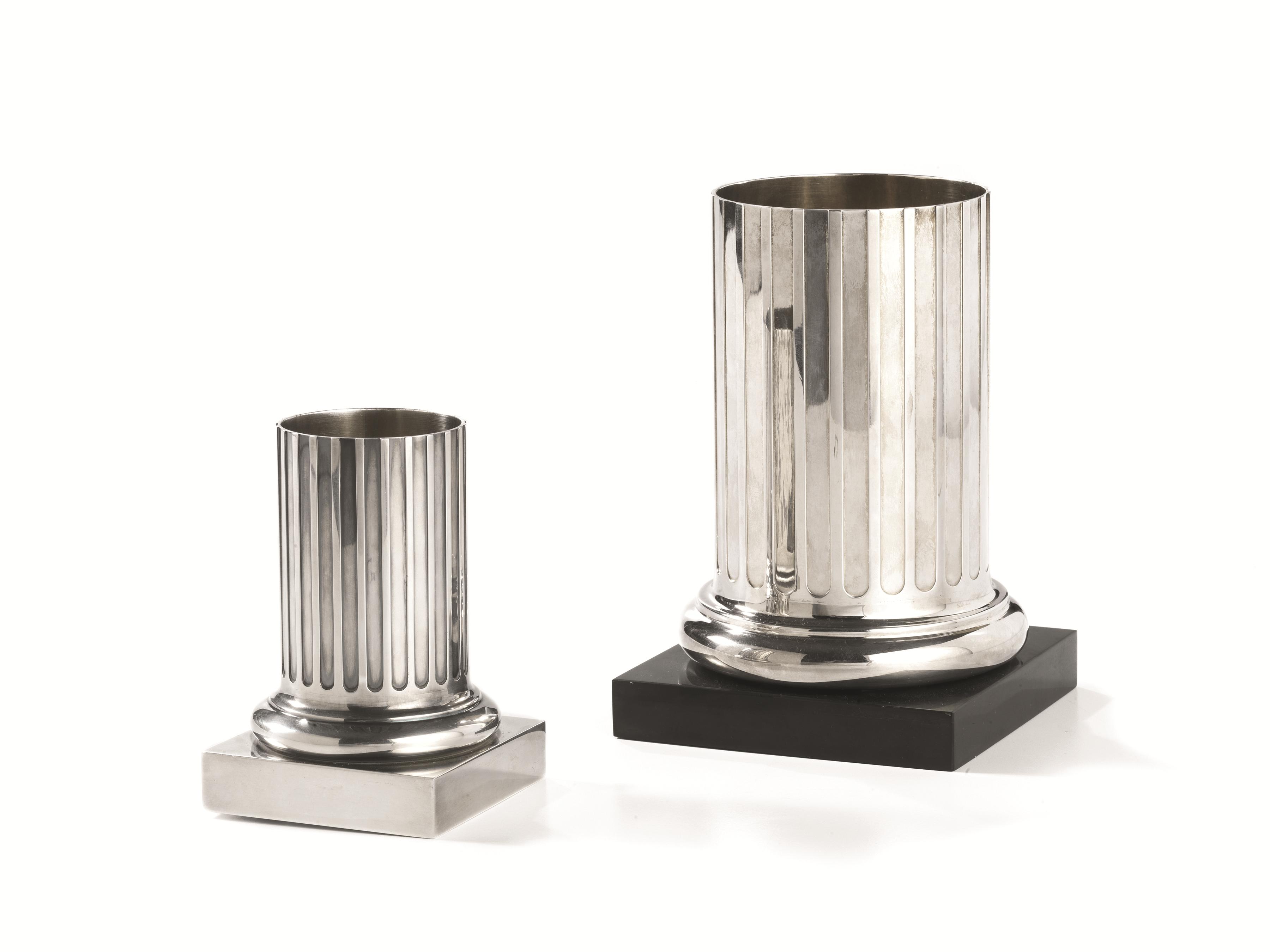 Mezzacolonna scanalata, firmata Bulgari, in argento, su base quadrata recante...
