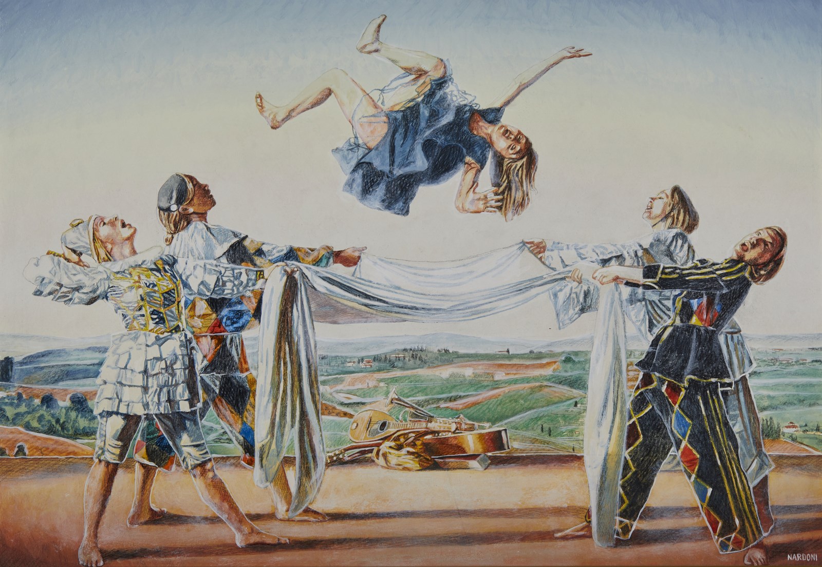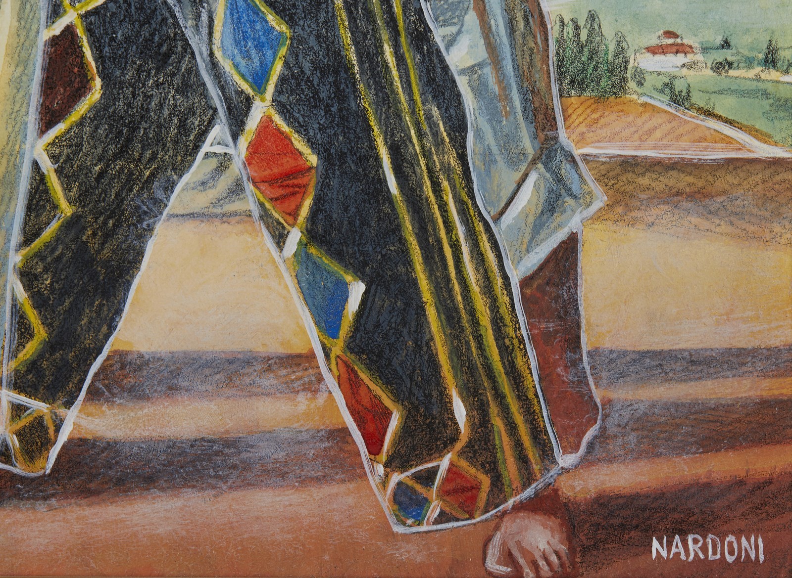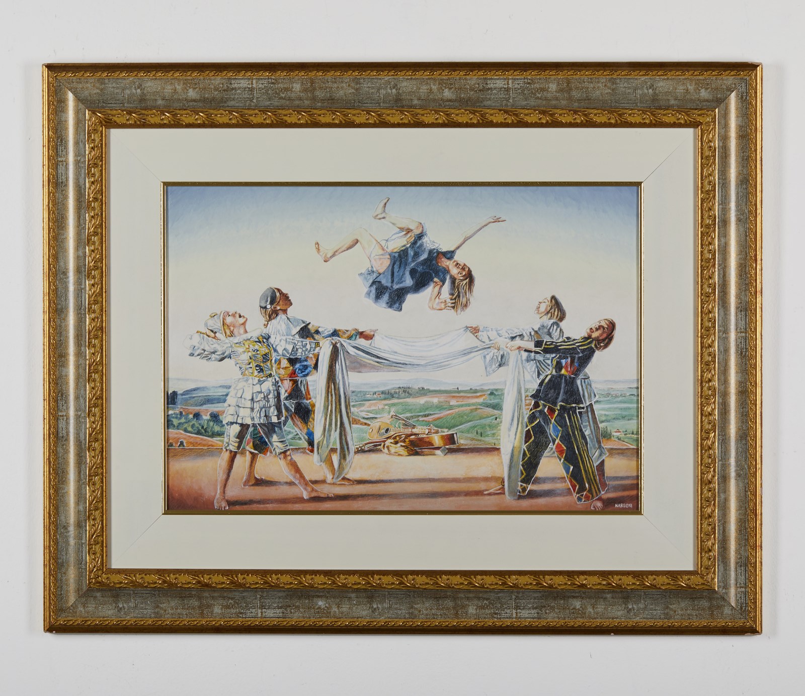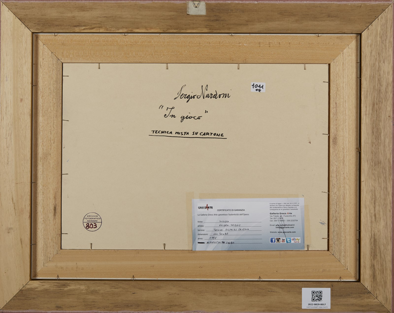 NARDONI SERGIO (n. 1947) In gioco. . 1998. Tecnica mista su cartone. Cm 50,00 x 35,00. Firma in basso a destra. Al retro firma, titolo e certificato di garanzia Galleria Greco Arte, Firenze. Autentica dell'artista su fotografia riportante il relativo numero d'inventario. Cornice presente