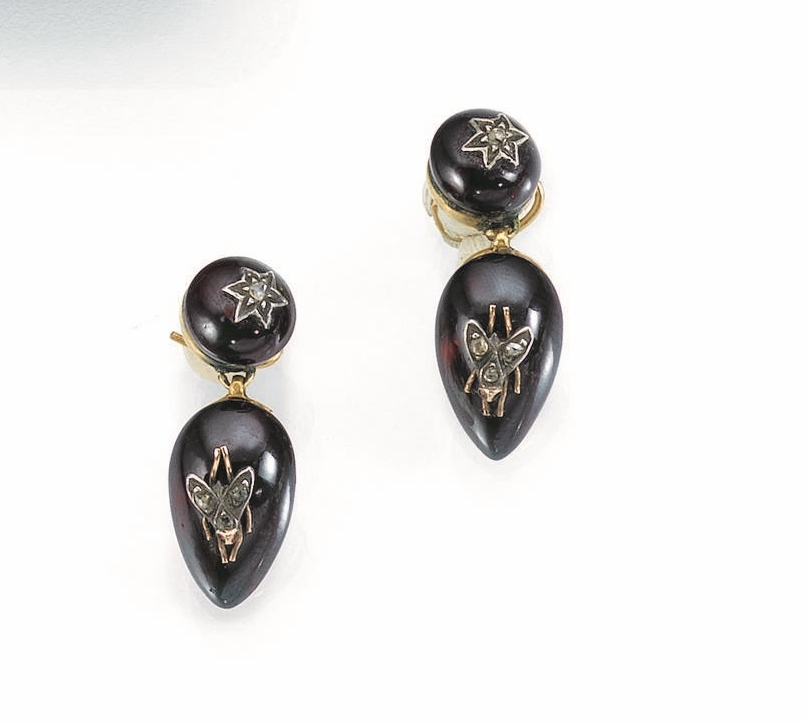 Paio di orecchini, fine sec. XIX, in oro a basso titolo, granati, diamanti e...