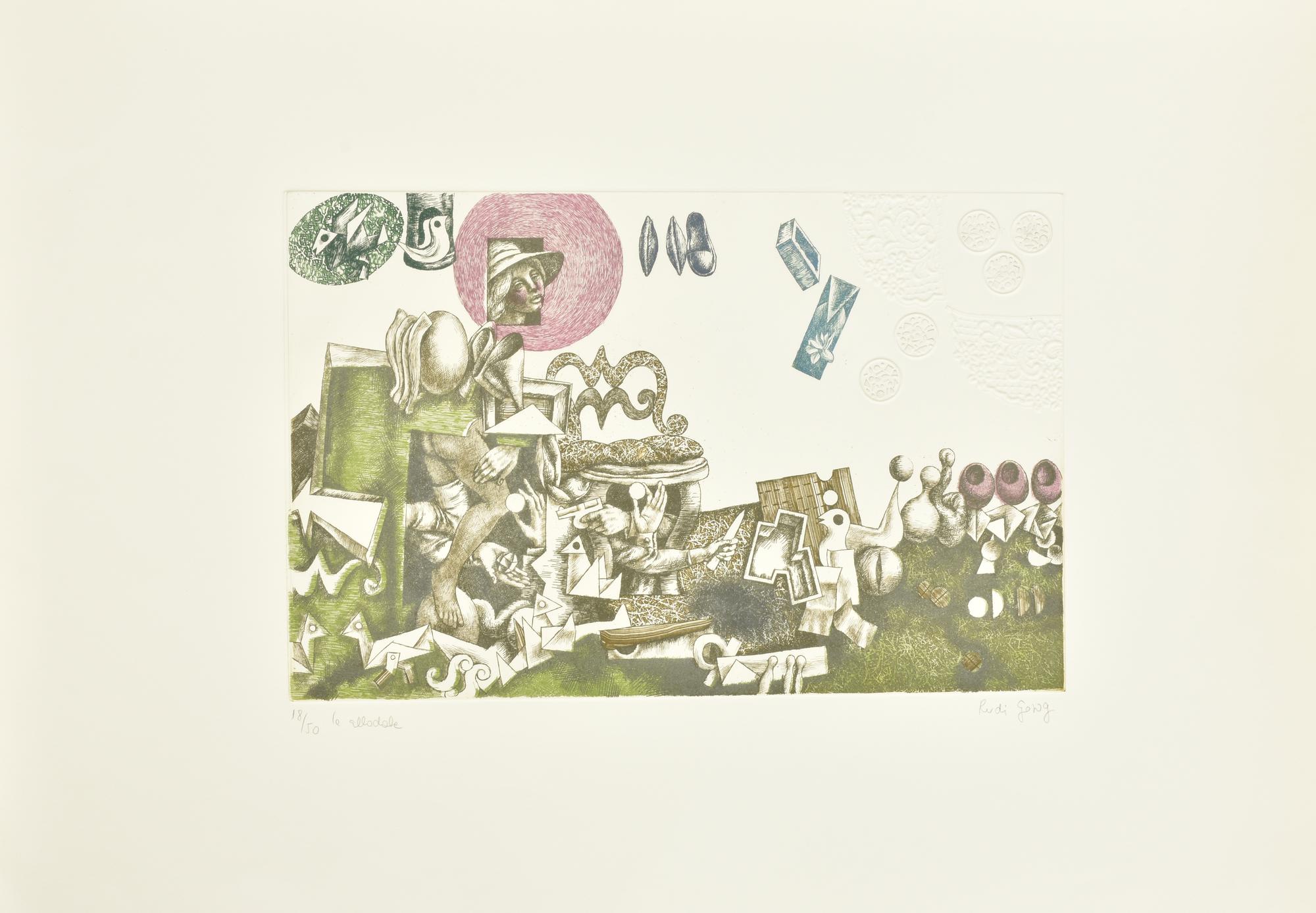 Rudi Gorog LE ALLODOLE incisione su carta, battuta cm 25,5x39, su foglio cm...