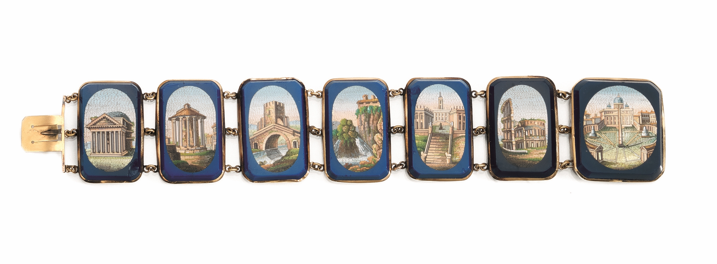 Bracciale, fine sec. XIX, in oro rosa, pasta vitrea e micromosaico