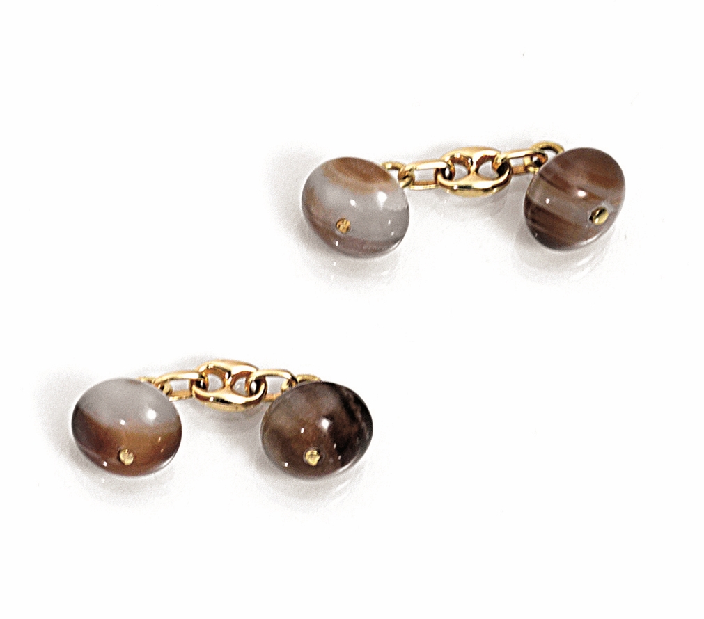 ciascuno realizzato come un doppio bottone in agata legato da maglie ovali e marina in oro giallo