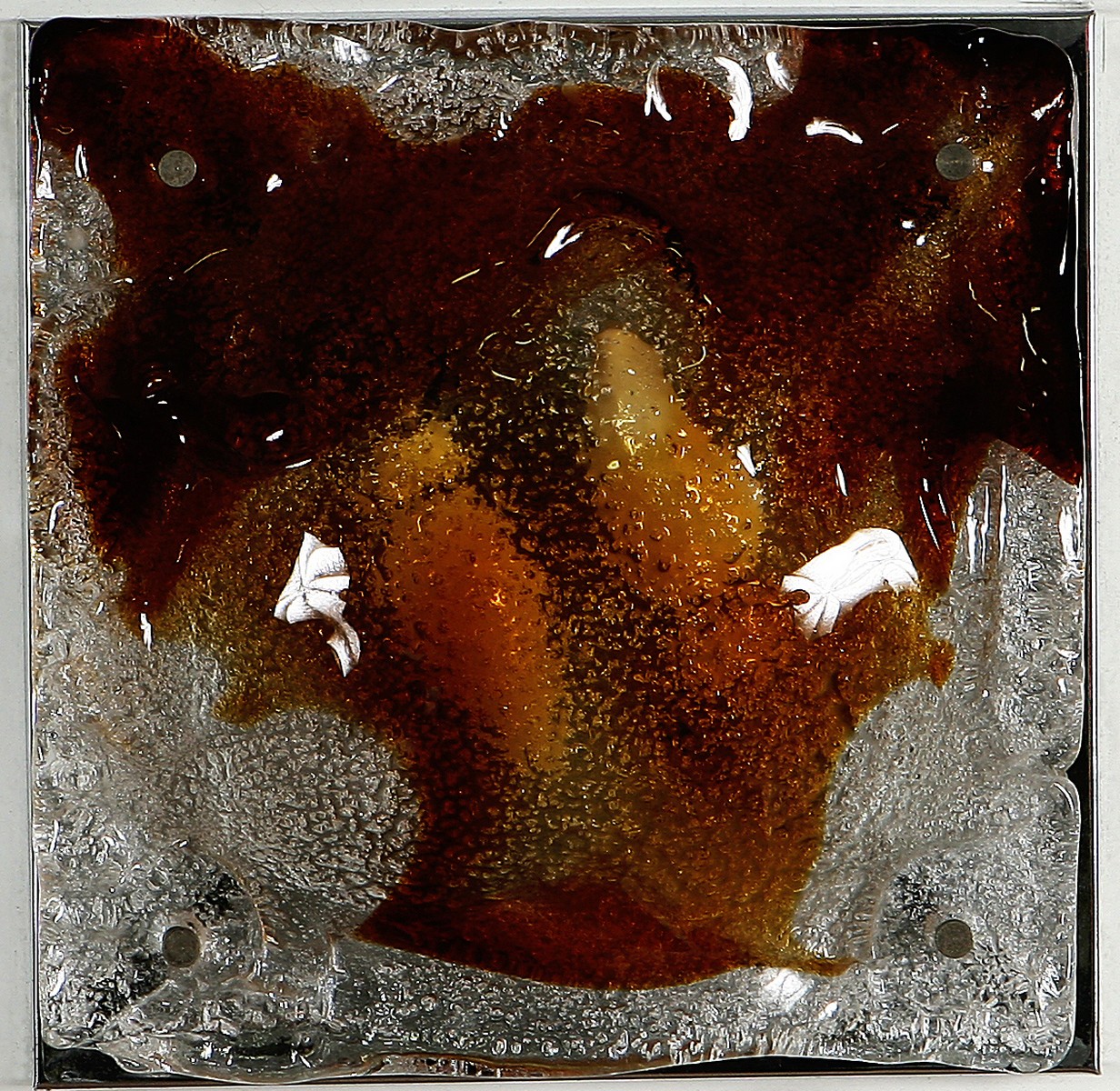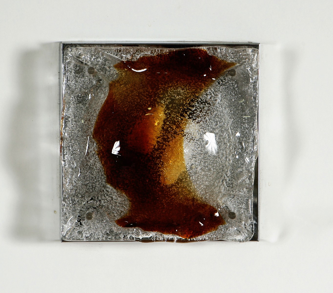 PRODUZIONE ITALIANA - ITALIAN WORK. Coppia di lampade da parete. Diffusori in vetro soffiato trasparente e colorato, struttura in metallo cromato. Pair of wall lamps. Blown glass diffusers, structure in chromed metal. Metallo e vetro. Cm 55x53x14. 1970 ca.