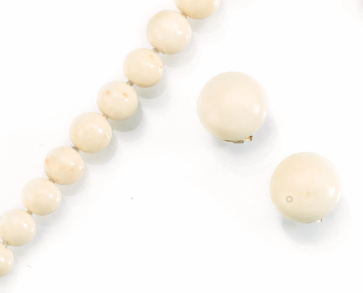la collana realizzata ad una fila di sfere in corallo poste in gradazione, fermatura in corallo rosa entro cornice cesellata in argento e oro giallo; gli orecchini ciascuno realizzato con una sfera schiacciata in corallo bianco, peso complessivo g 134