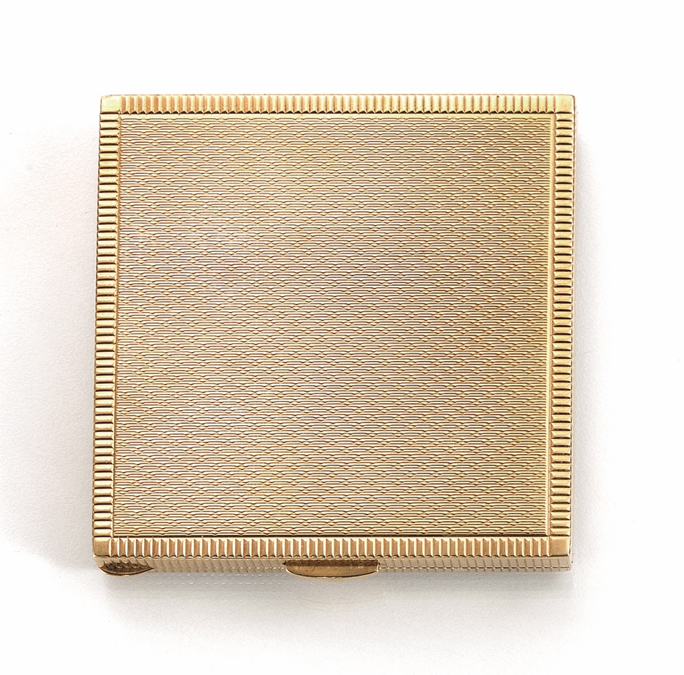 Scatola portacipria in oro giallo di forma quadrata, interamente incisa a...