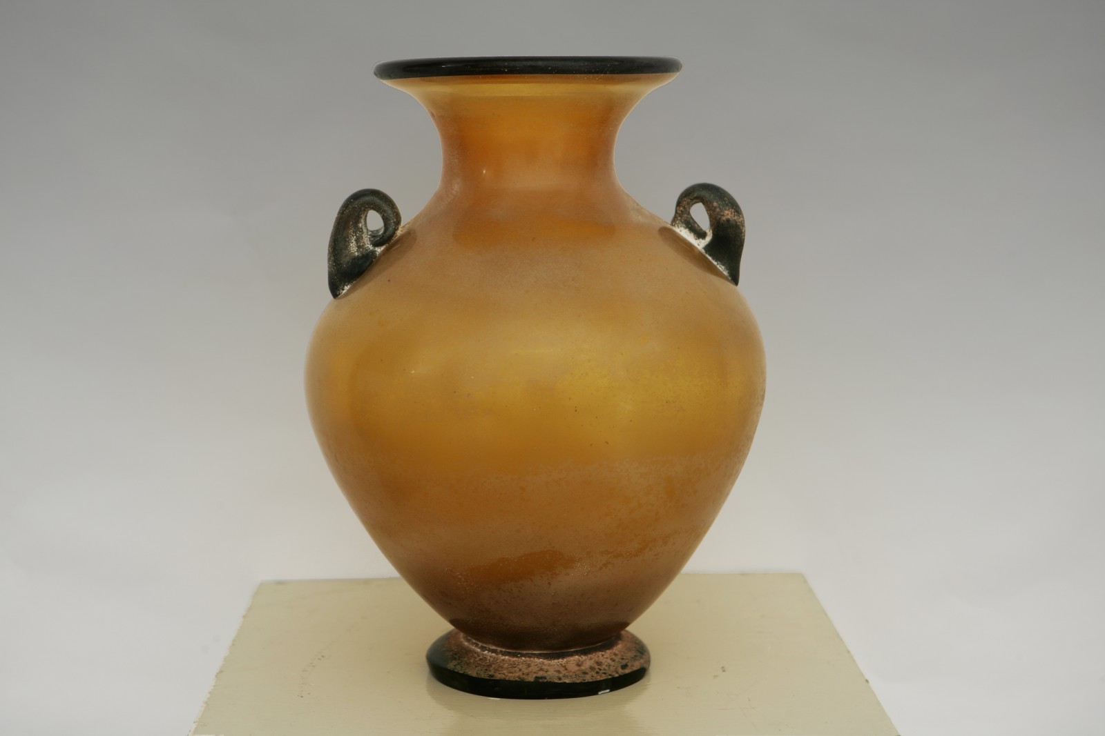 TOSO STEFANO. Vaso in vetro di Murano color ambra. Corpo globulare con 2 ansette a voluta. Murano glass amber vase. Globular body with 2 loops. Vetro di Murano. Cm 26x39. 1990 ca.