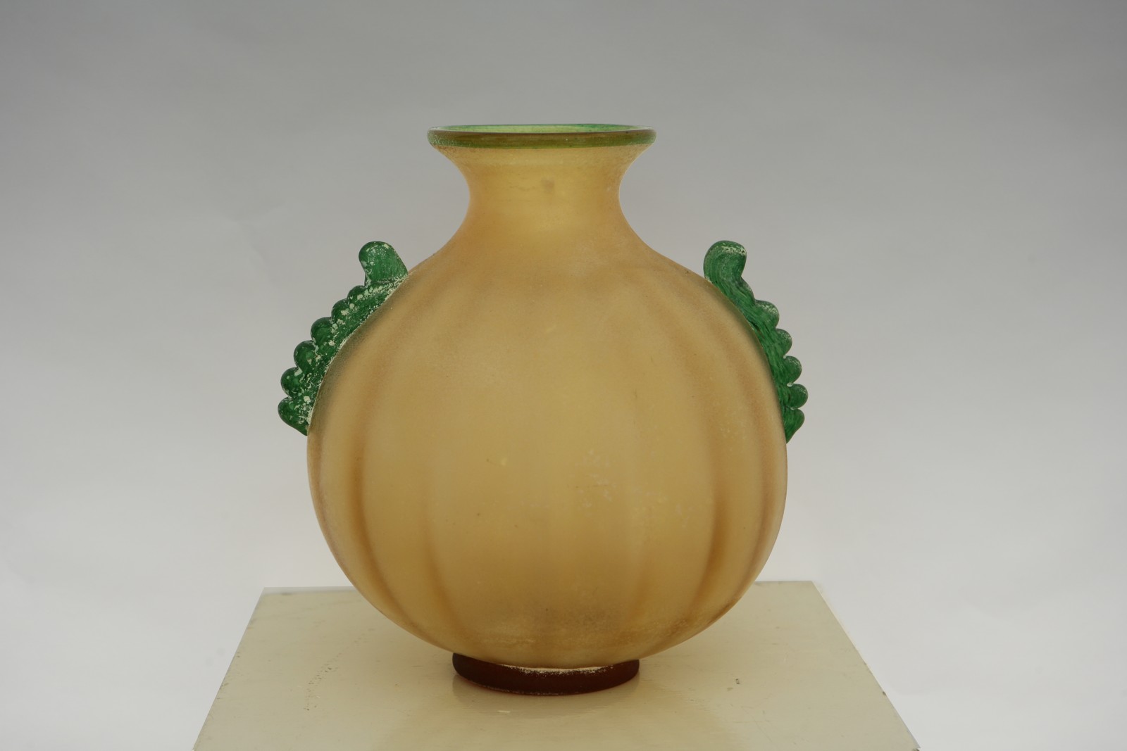 Vaso a boccia in vetro satinato giallo , con anse minime in vetro verde....