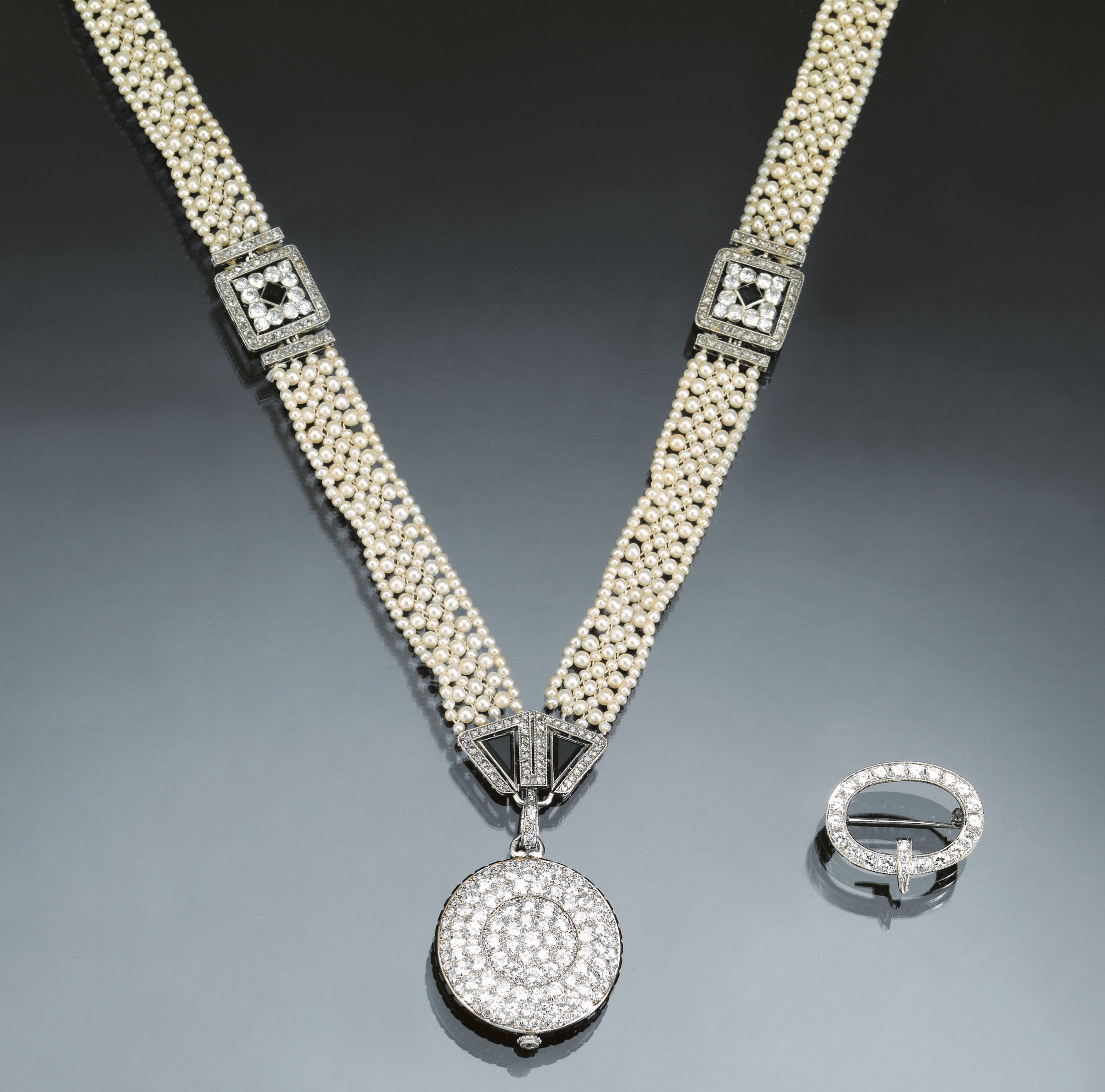 Sautoir con orologio pendente Cartier, anni '20, in oro bianco, microperle, diamanti e onice e spilla in oro bianco e diamanti