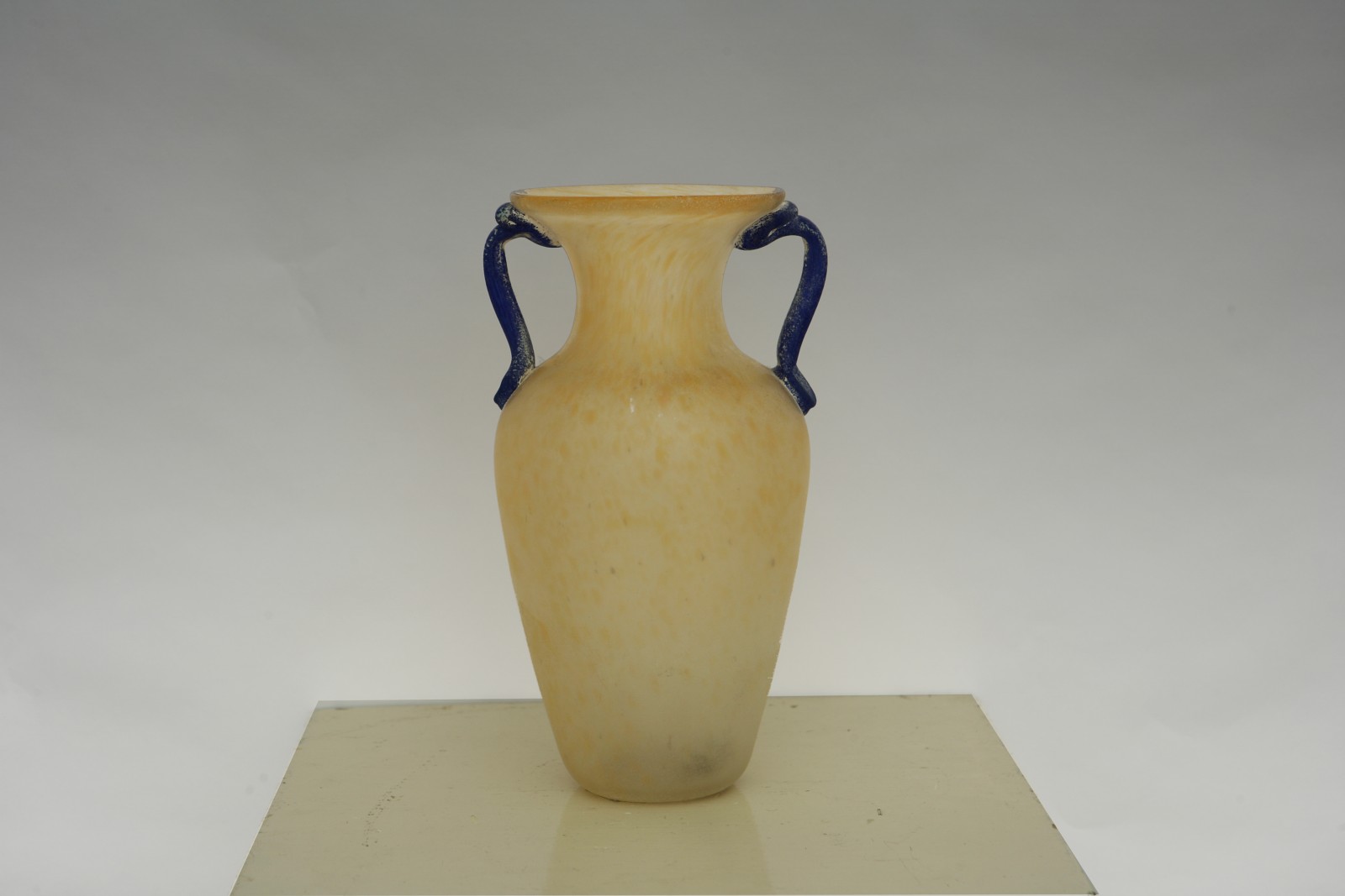 Lot 96 | TOSO STEFANO. Vaso in vetro giallo satinato con 2 ansette blu.Yellow satin...