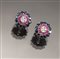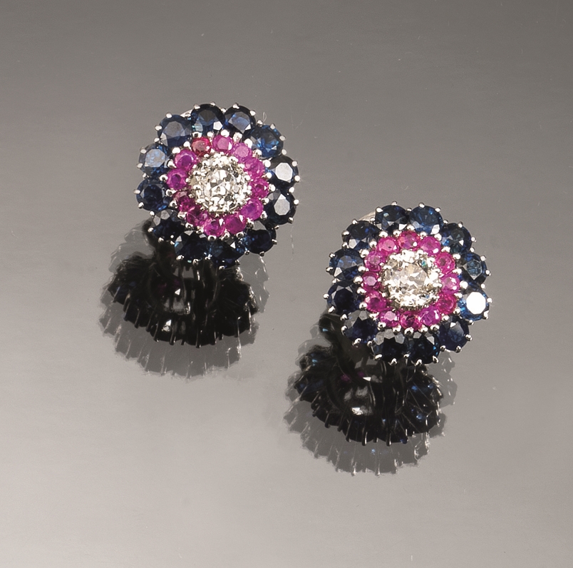 ciascuno disegnato come una corolla centrata da un brillante di taglio vecchio montato entro un doppia cornice in rubini e zaffiri, g 11