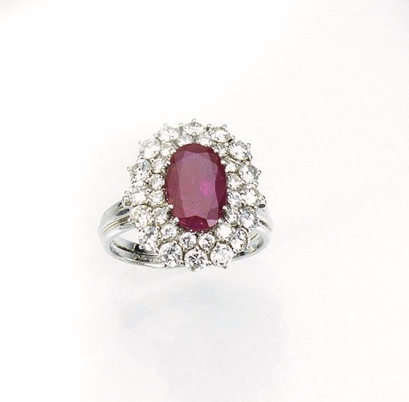 al centro rubino ovale montato entro una doppia cornice di brillanti, g 5