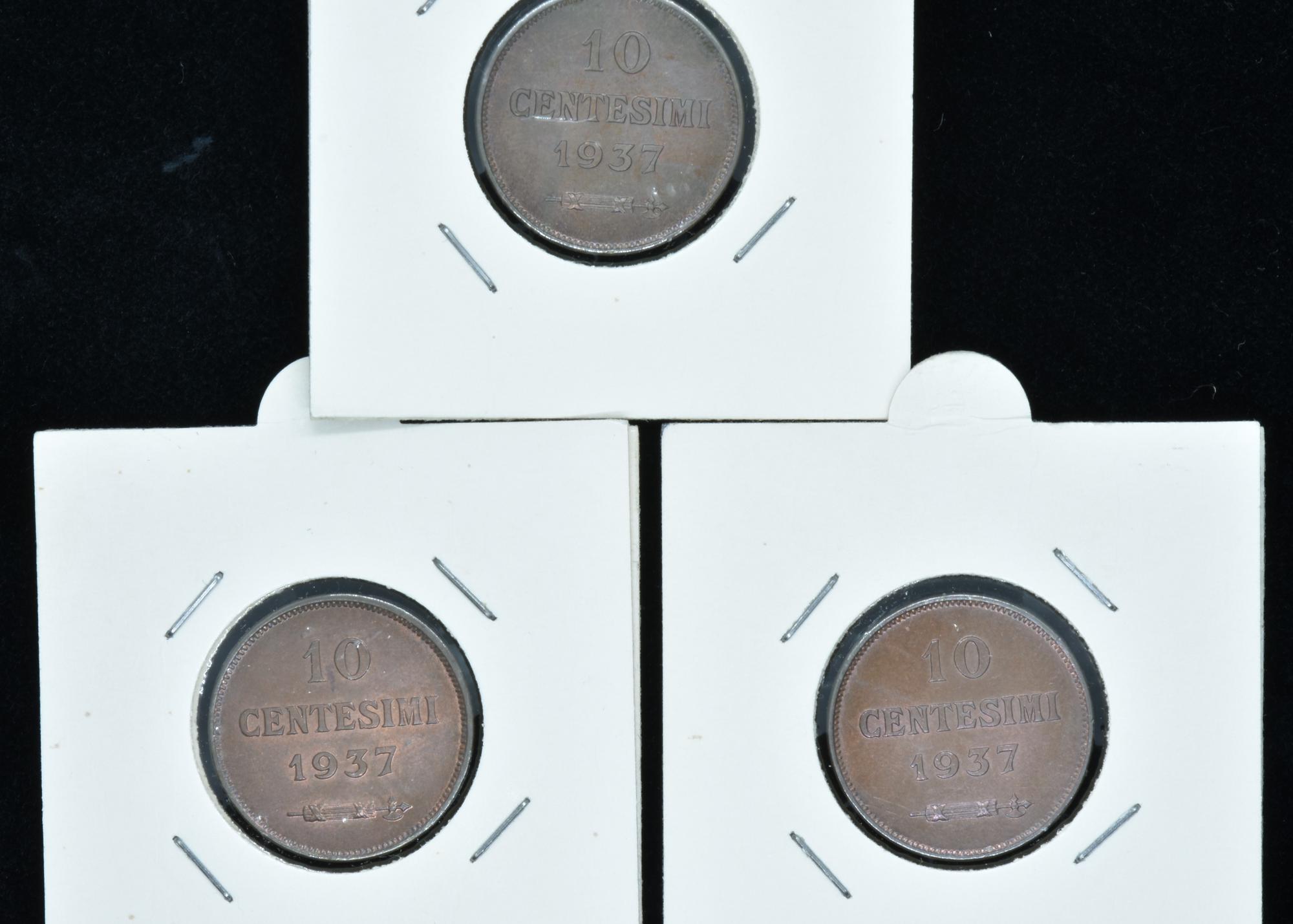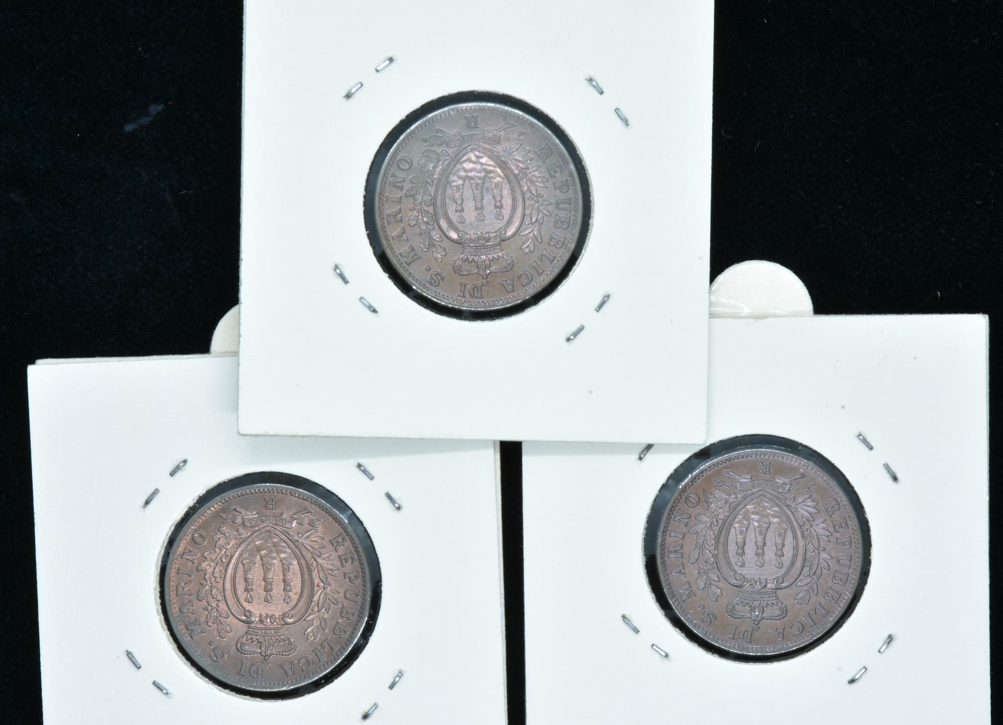 Previous Lot 174 Next Livebid - Via Tiziano Vecellio 34/D, 10126 Torino MONETE DEL MONDO E ITALIANE Sessione Unica Wednesday 5 October 2022 hours 21:00 (UTC +01:00) LOTTO DI TRE MONETE 10 CENTESIMI SAN MARINO 1937 LOTTO DI TRE MONETE 10 CENTESIMI SAN MARINO 1937