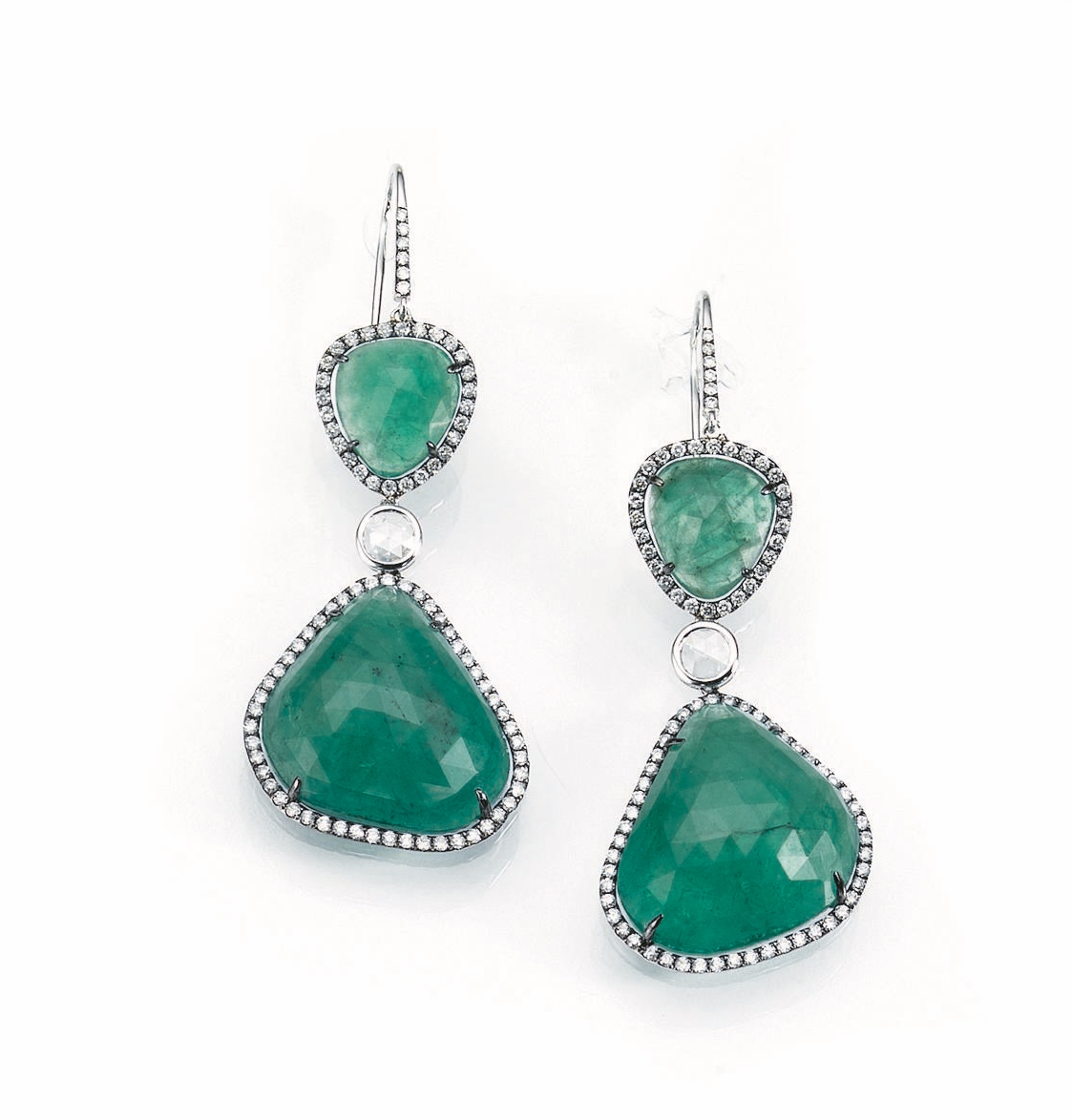 Paio di orecchini pendenti in oro bianco, smeraldi e diamanti