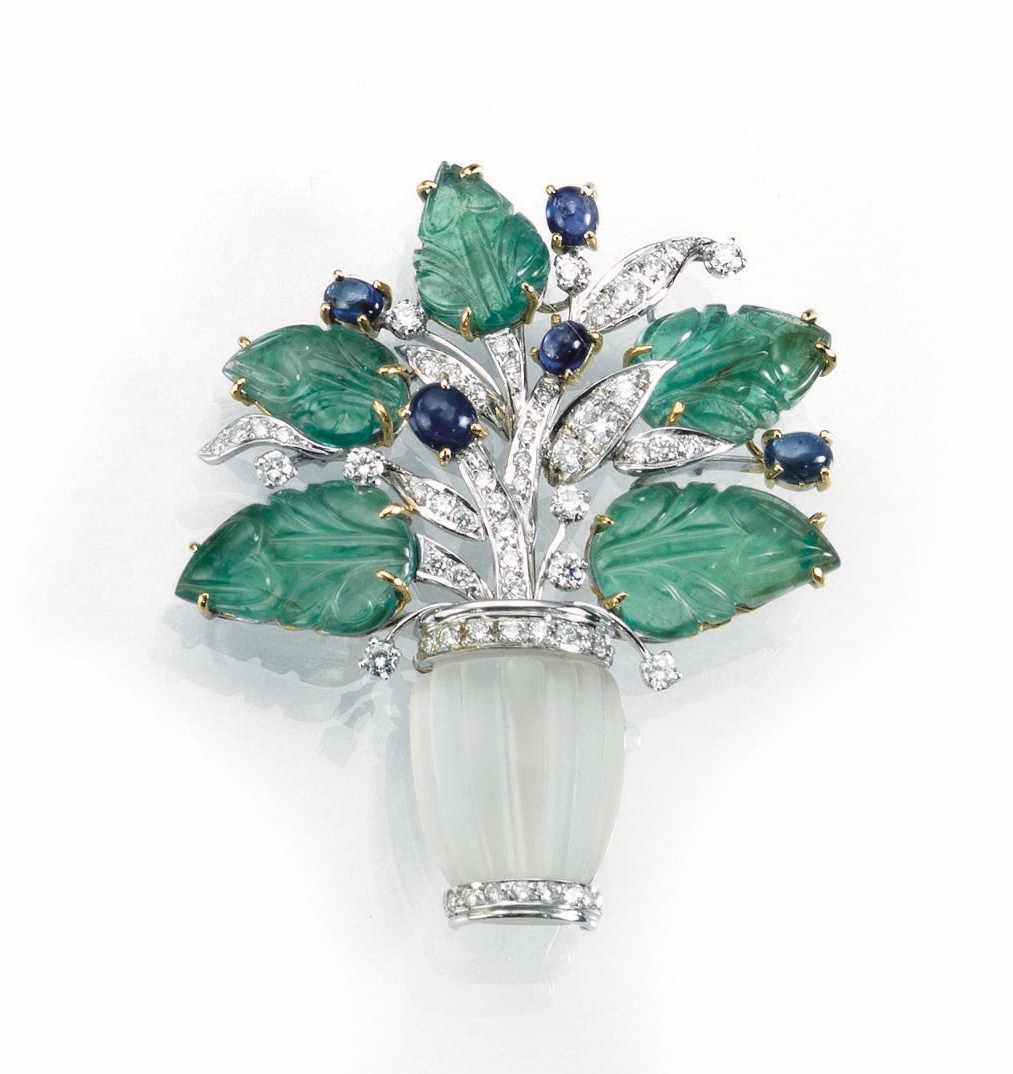 realisticamente modellata come un vaso di fiori, il corpo del vaso in cristallo di rocca inciso con montatura in oro bianco e brillanti, gli steli in oro bianco e brillanti, le foglie ed i fiori in smeraldi incisi e zaffiri ovali cabochon, g 24