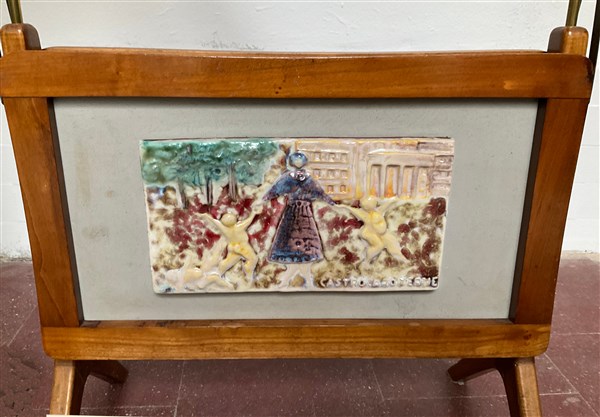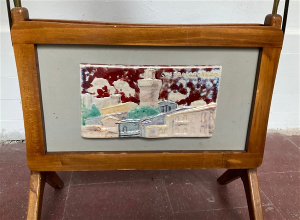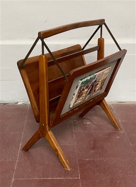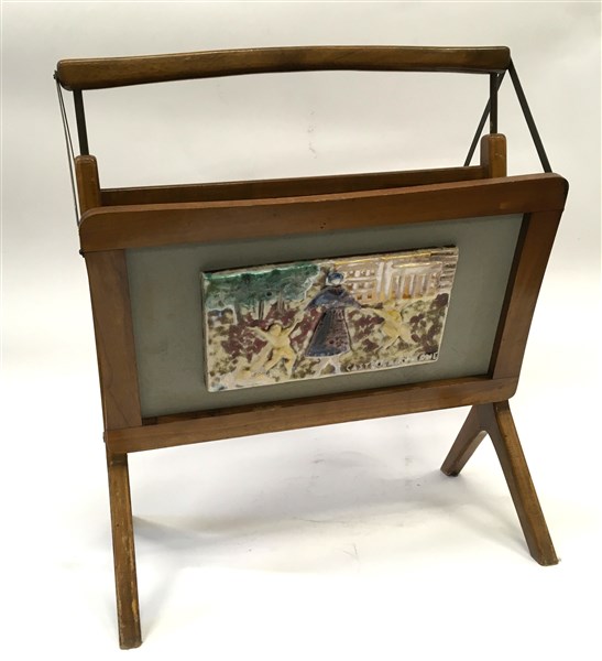 Portariviste in legno con sponde richiudibili centrate da piastrelle di Carlo Zauli in ceramica smaltata in policromia raffiguranti scorci di Castrocaroterme. (cm 46x52x27) (lievi difetti)