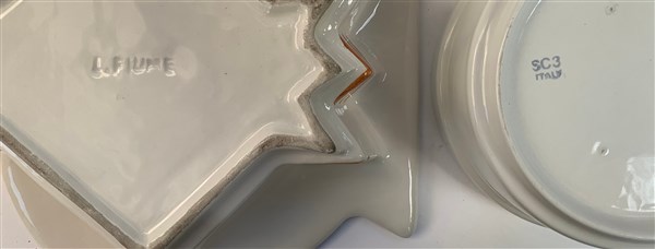 Lotto composto da un posacenere in ceramica smaltata bianca, un vaso in ceramica decorato con foglie di platano della manifattura SC3, Italia, secolo XX unito a un centrotavola a forma di pesce in ceramica smaltata bianca, nera e marrone firmato sotto la base Laura Fiume. (misure diverse)
