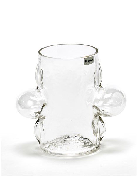 Vaso della serie "Bolle". Manifattura VeArt, Murano, anni '70. Vetro trasparente incolore. Recante etichetta adesiva della manifattura. (h cm 18)