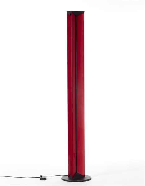 Lampada alogena a totem. Italia, anni '80/'90. Base rivestita in gomma, struttura in metallo verniciato rosso e nero. (h cm 184)