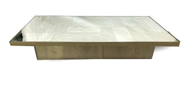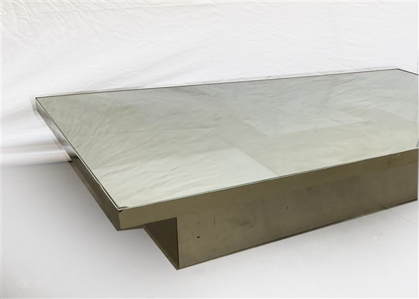 Tavolino da salotto in metallo con piano suddiviso a riquadri spazzolati e specchiati e sovrapiano in vetro. Anni '70/'80. (cm 150x26,5x80,5) (difetti)