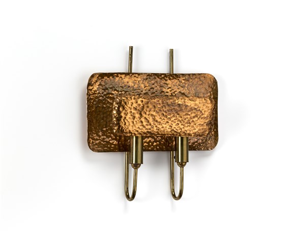 Lampada da parete a due luci in lastra di rame sbalzata e ottone. Italia, anni