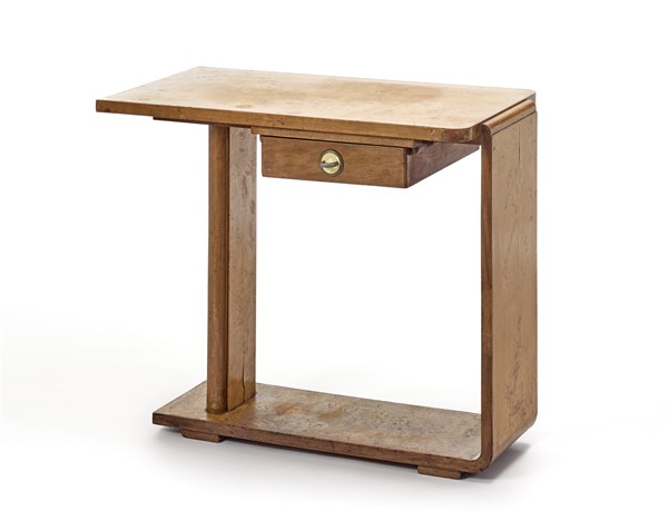 Scrittoio da centro Novecento in legno massello e impiallacciato in radica con cassettino e maniglia in madreperla e metallo. Italia, anni '30. (cm 92x77x50) (difetti)