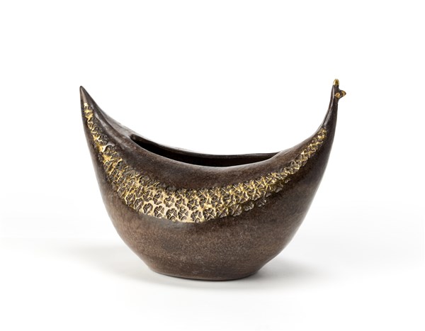 Scultura in ceramica smaltata in bruno con decori oro raffigurante un gallo. Italia, seconda metà secolo XX. Numerata 2146 e locata sotto la base. (cm 28,5x20,5)