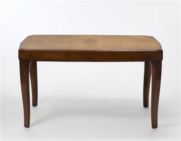 Tavolo da pranzo Barocchetto in legno massello e impiallacciato con piano in radica con settori disposti a macchia aperta di forma leggermente sagomata, gambe sagomate e leggermente rastremate, elementi in ottone lungo il bordo. Italia, anni '30. (cm 155x78x100) (difetti)