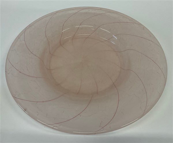Grande piatto decorativo in vetro soffiato incolore opalescente e rosa con fasce spiraliformi rosa scuro. Murano, anni '80. (d cm 53)