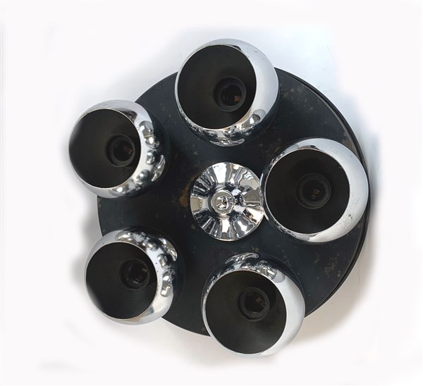 Lotto composto da una lampada da soffitto a cinque luci in metallo cromato, str