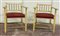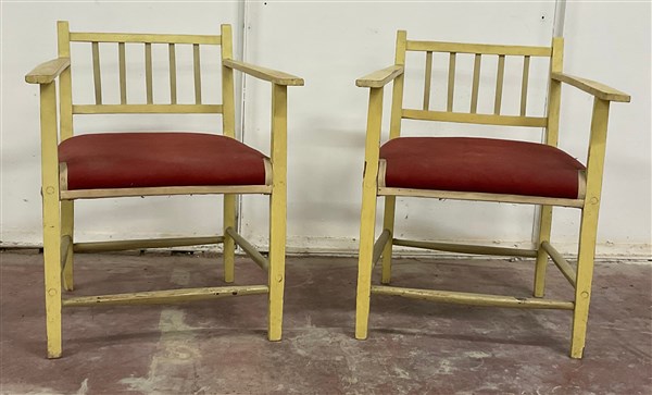 Coppia di poltroncine moderniste in legno verniciato giallino con schienali a listelli e sedute rivestite in tessuto bordeaux. Italia, inizio secolo XX. (cm 60x75x55) (difetti)