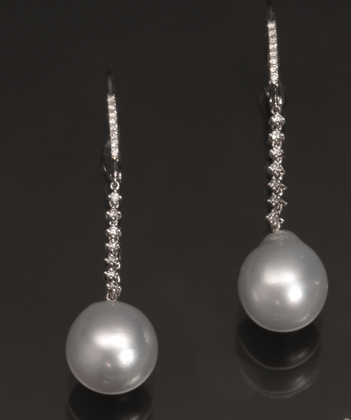 Paio di orecchini pendenti in oro bianco 14 kt, perle South Sea e diamanti