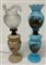 Lotto composto da una lampada ad olio in opaline celeste decorata con decalcomanie raffiguranti scene galanti, ed una lampada ad olio in opaline beige dipinta con rami fioriti (h cm 55) (difetti e mancanze)