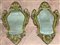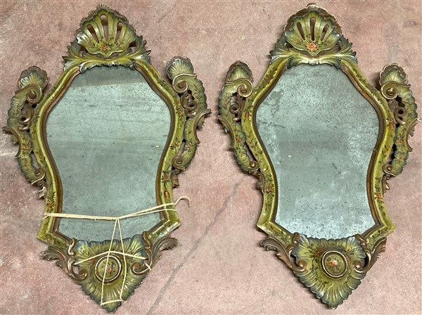 Coppia di ventole di forma sagomata in legno intagliato, laccato e dipinto a fiori, decorate da fregi a volute e cimasa traforata a valva di conchiglia. Etichetta di provenienza al retro La Cisterna, Ferrara (cm 63x42) (mancanze e restauri)