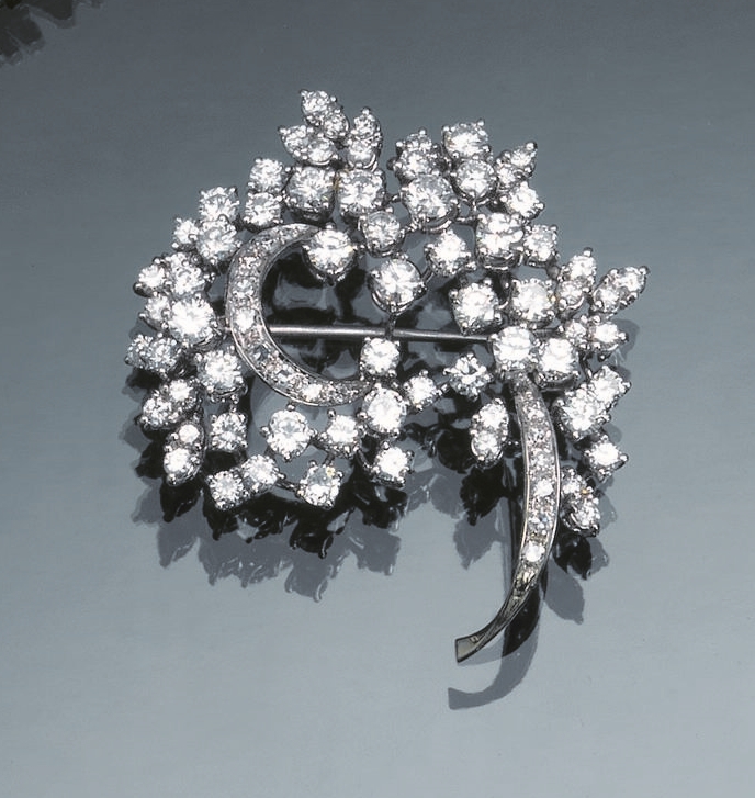 Spilla in oro bianco e diamantimodellata a tralcio floreale tempestato di...