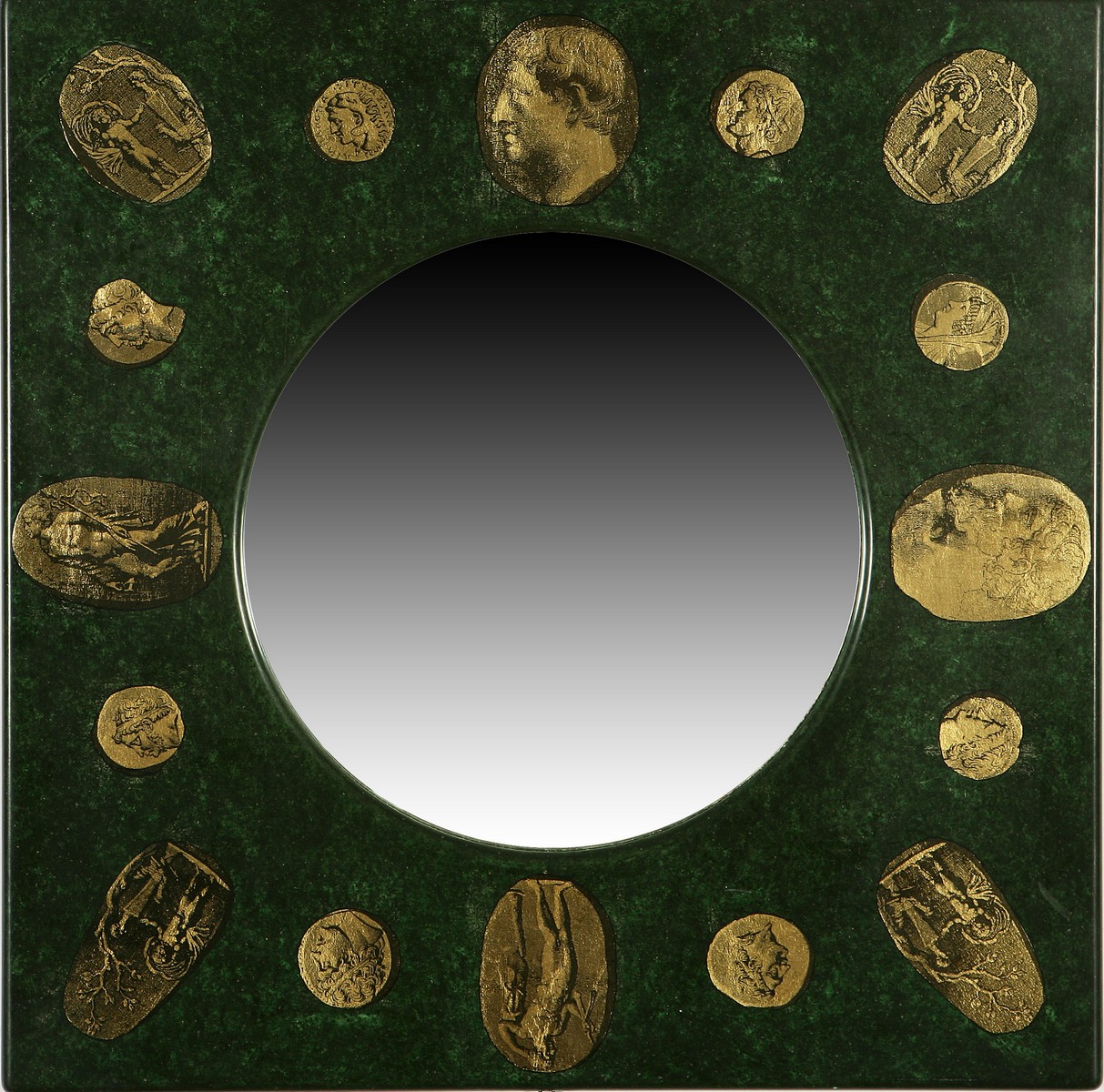 FORNASETTI PIERO (1913 - 1988). Specchio da parete a "cammei su malachite. "Cameos" on malachite wall mirror. Serigrafia su legno. Cm 50x5x50. Sul retro marchio del produttore. Producer label on the back. 1970.