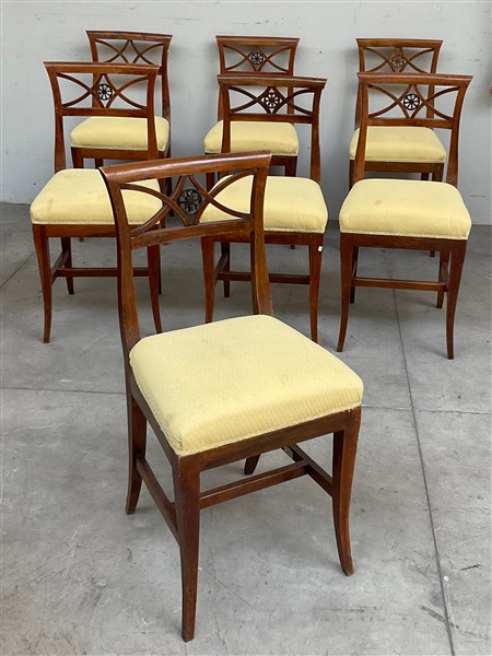 Gruppo dei sette sedie in legno intagliato con schienale a giorno e gambe a sciabola. Veneto, secolo XIX (difetti e mancanze)