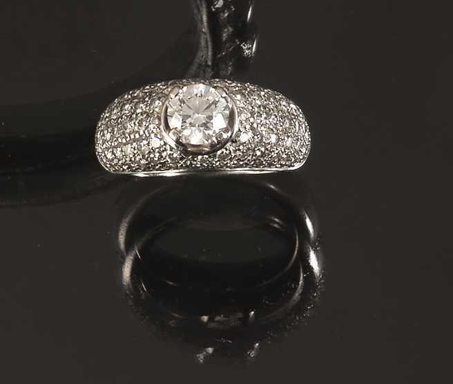 a fascia bombata decorata in pave di brillanti con diamante centrale di ct 1,10 circa, g 14