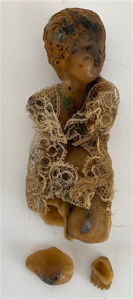 Arte del secolo XVII, scultura in cera raffigurante Gesù Bambino con applicazioni in pizzo (h. cm 13) (difetti e mancanze)