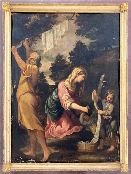 Ignoto, antico dipinto, copia da Lucio Massari, raffigurante "La Madonna del bucato", olio su tela (cm 114,5x86,5). In cornice