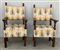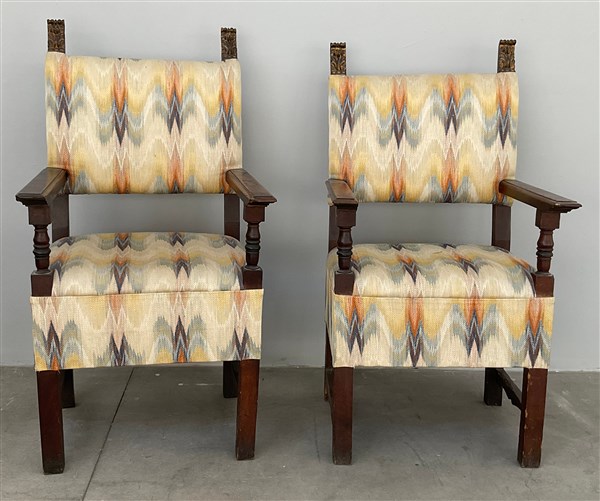 Coppia di antiche poltrone rinascimentali con schienale decorato da pinnacoli in legno intagliato con tracce di doratura, braccioli con sostegni torniti, gambe dritte e squadrate. Rivestimento in tessuto fiammato (difetti)
