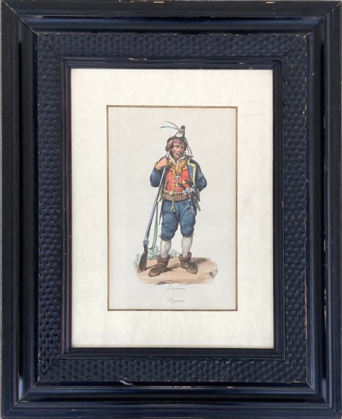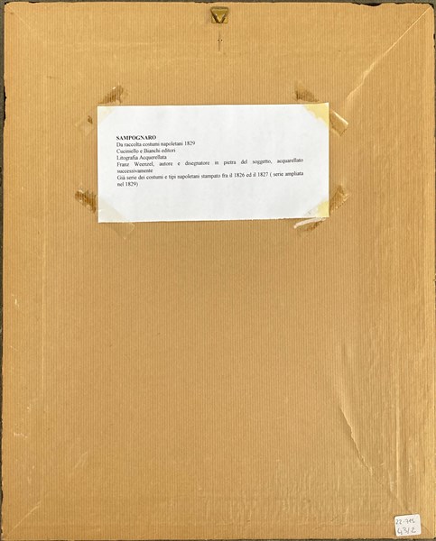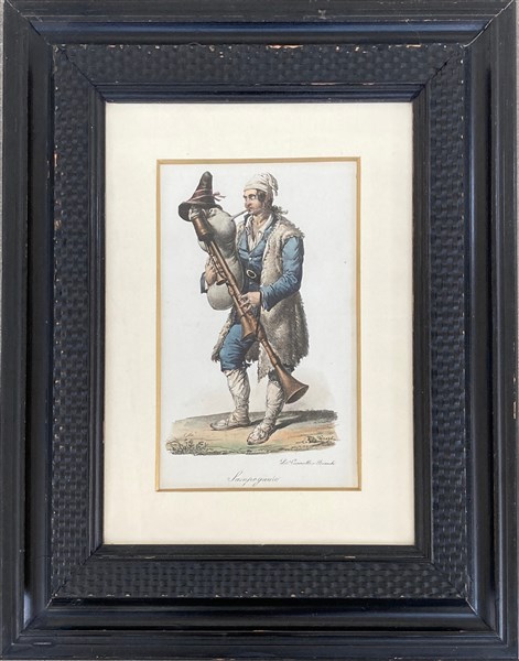 Lotto composto da due litografie acquerellate raffiguranti "Sampognaro" e "Brigante" (cm 30,5x23,5) in cornici in legno intagliato ed ebanizzato (difetti) La lito del Sampognaro proviene dalla Raccolta di costumi napoletani del 1829 di Cuciniello e Bianchi editori