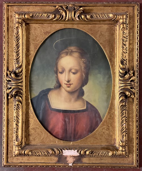 Lotto composto da tre fra riproduzioni e dipinti raffiguranti la Vergine Maria. In cornici (difetti)