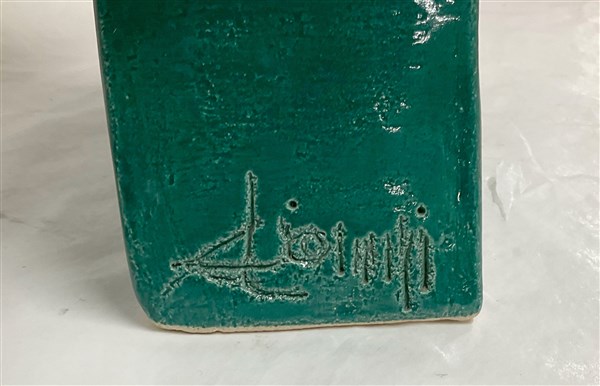 Firma indecifrata, scultura astratta in gesso smaltato verde (h. cm 47) firmata su un fianco