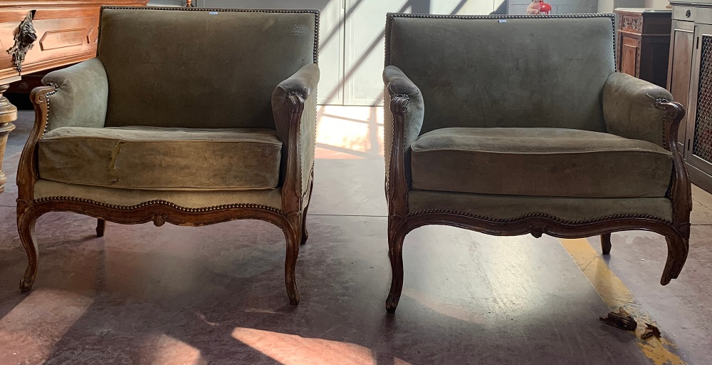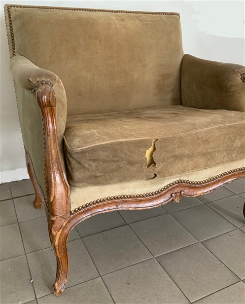 Coppia di poltrone in noce con schienale squadrato, gambe e braccioli mossi intagliati. Secolo XVIII (difetti e restauri)