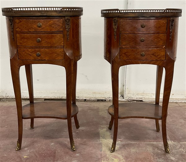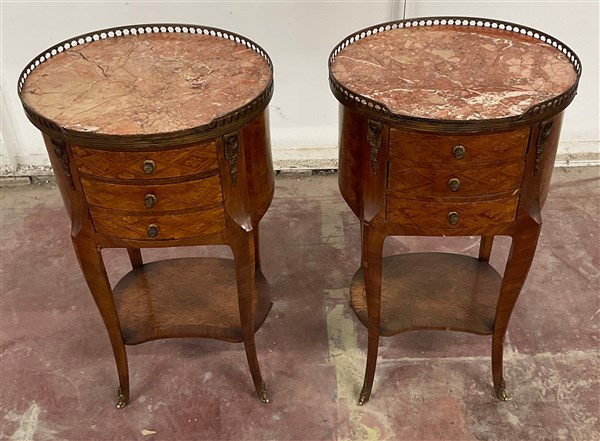 Coppia di comodini ovali a tre cassetti con gambe mosse, lastronati e intarsiati a marqueterie, piano in marmo e guarnizioni in metallo (cm 39x70x31) (difetti)
