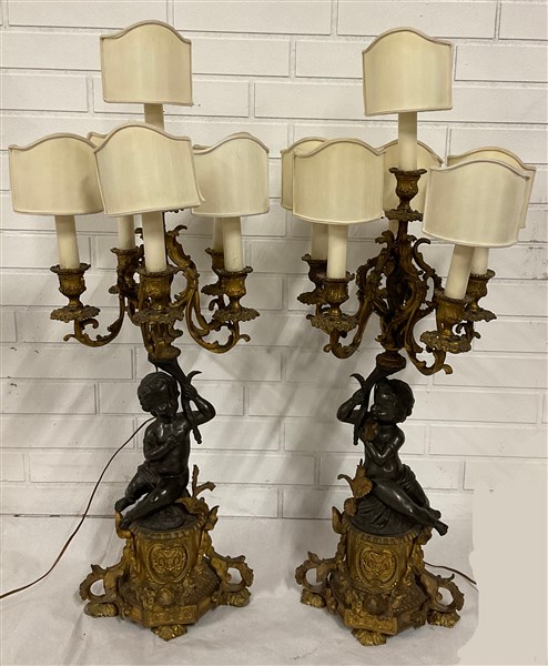 Coppia di candelabri a sei fiamme in bronzo parzialmente dorato, fusti con amorini bruniti e decori a motivi naturalistici (h cm 65), montati a luce elettrica (h con paralumi cm 86) (difetti e mancanze)